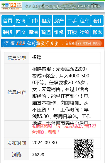 招聘客服:无责底薪2200+提成+奖金,月入4000-5000不等。任职要求20-45岁,女,无需销售,有过电话客服经验,能坐住有耐心!电脑基本操作,岗前培训。从不压资!!!工作时间:早9晚5.30,每周日单休。工作地点:七台河市民中心后电子商务产业园406联系电话:15561538893于15561538893 【电话咨询时,请一定说明在七台河信息网看到的,谢谢!】 |
