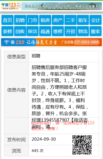 招聘售后服务部招聘客户服务专员,年龄25周岁-48周岁,性别不限。1,工作时间自由,方便照顾老人和孩子。2,收入下有保底上不封顶,终身底薪。3,福利待遇,应有尽有。4,保险,旅游,晋升,机会多多。张经理13945587907 【电话咨询时,请一定说明在七台河信息网看到的,谢谢!】 |