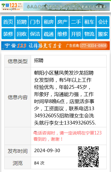 朝阳小区慧凤美发沙龙招聘女发型师,有5年以上工作经验优先,年龄25-45岁,形象好,沟通能力强,工作时间早8晚6点,店里活多事少,工资面议,联系电话13349326055招助理女生会洗头就行李女士13349326055 【电话咨询时,请一定说明在七台河信息网看到的,谢谢!】 |