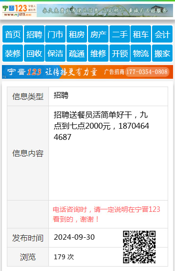 招聘送餐员活简单好干,九点到七点2000元,18704644687