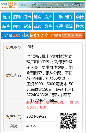 七台河市桃山区绿能垃圾处理厂顺裕劳务公司招聘看溜子人员,要求身体健康,能吃苦耐劳,服从分配,不怕灰不怕味,年龄60岁以下,工资3000~5000元饭补150元满勤奖150元,联系电话18724646568(蔡队)蔡军武18724646568 【电话咨询时,请一定说明在七台河信息网看到的,谢谢!】 |
