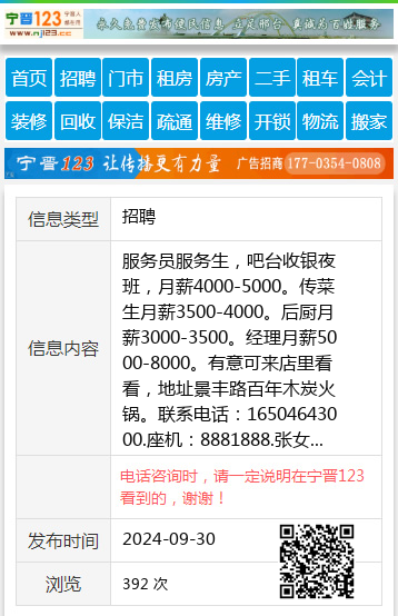 服务员服务生,吧台收银夜班,月薪4000-5000。传菜生月薪3500-4000。后厨月薪3000-3500。经理月薪5000-8000。有意可来店里看看,地址景丰路百年木炭火锅。联系电话:16504643000.座机:8881888.张女士16504643000 【电话咨询时,请一定说明在七台河信息网看到的,谢谢!】 |