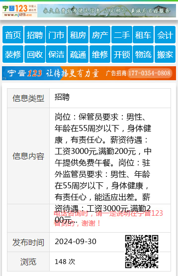 岗位:保管员要求:男性、年龄在55周岁以下,身体健康,有责任心。薪资待遇:工资3000元,满勤200元,中午提供免费午餐。岗位:驻外监管员要求:男性、年龄在55周岁以下,身体健康,有责任心,能适应出差。薪资待遇:工资3000元,满勤200元,出差有补助,报销路费。岗位:安全员要求:男性、年龄在55周岁以下,有安全证,负责现场管理及内业。薪资待遇:工资3500元,试用期3个月,试用期内工资3200元,中午提供免费午餐。联系电话:15204641004赵女士15204641004 【电话咨询时,请一定说明在七台河信息网看到的,谢谢!】 |