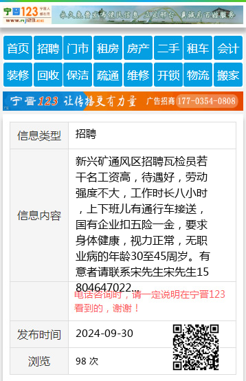 新兴矿通风区招聘瓦检员若干名工资高,待遇好,劳动强度不大,工作时长八小时,上下班儿有通行车接送,国有企业扣五险一金,要求身体健康,视力正常,无职业病的年龄30至45周岁。有意者请联系宋先生宋先生15804647022 【电话咨询时,请一定说明在七台河信息网看到的,谢谢!】 |