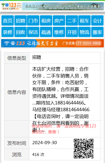 本店扩大经营,招聘:合作伙伴,二手车销售人员,男女不限,条件:吃苦耐劳,有团队精神,合作共赢,工资待遇优越。详细情况面谈…期待加入18814644466。马经理马经理18814644466 【电话咨询时,请一定说明在七台河信息网看到的,谢谢!】 |