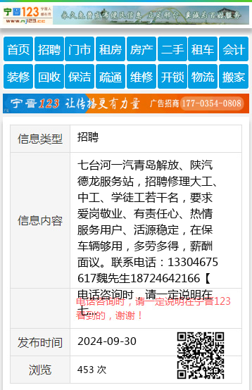 七台河一汽青岛解放、陕汽德龙服务站,招聘修理大工、中工、学徒工若干名,要求爱岗敬业、有责任心、热情服务用户、活源稳定,在保车辆够用,多劳多得,薪酬面议。联系电话:13304675617魏先生18724642166 【电话咨询时,请一定说明在七台河信息网看到的,谢谢!】 |