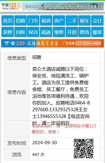 昆仑大酒店诚聘以下岗位:保安员、地毯清洗工、锅炉工。酒店为员工提供免费宿舍楼、员工餐厅,免费员工浴池等各项福利待遇,欢迎你的加入。应聘电话0464-8297600.13329325328王女士13946555328 【电话咨询时,请一定说明在七台河信息网看到的,谢谢!】 |