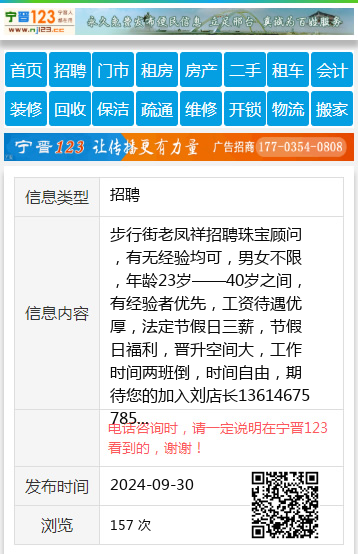 步行街老凤祥招聘珠宝顾问,有无经验均可,男女不限,年龄23岁——40岁之间,有经验者优先,工资待遇优厚,法定节假日三薪,节假日福利,晋升空间大,工作时间两班倒,时间自由,期待您的加入刘店长13614675785 【电话咨询时,请一定说明在七台河信息网看到的,谢谢!】 |