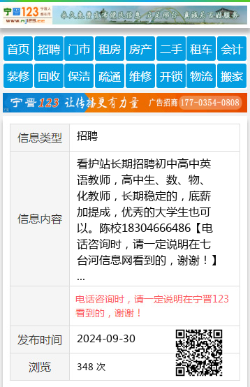 看护站长期招聘初中高中英语教师,高中生、数、物、化教师,长期稳定的,底薪加提成,优秀的大学生也可以。陈校18304666486 【电话咨询时,请一定说明在七台河信息网看到的,谢谢!】 |