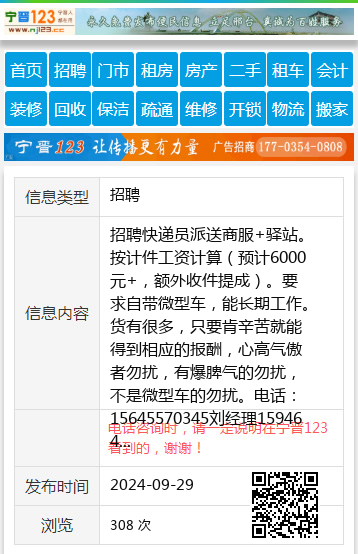 招聘快递员派送商服+驿站。按计件工资计算(预计6000元+,额外收件提成)。要求自带微型车,能长期工作。货有很多,只要肯辛苦就能得到相应的报酬,心高气傲者勿扰,有爆脾气的勿扰,不是微型车的勿扰。电话:15645570345刘经理15946420992 【电话咨询时,请一定说明在七台河信息网看到的,谢谢!】 |