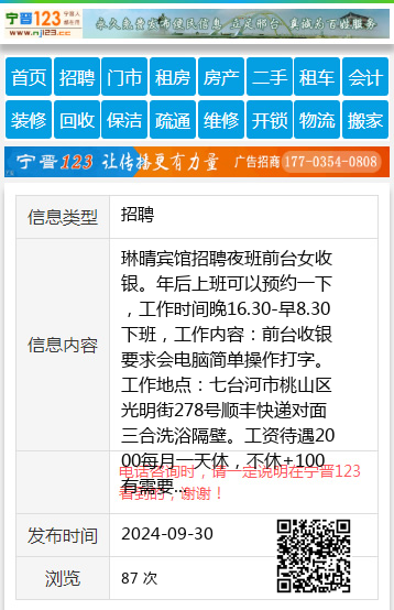 琳晴宾馆招聘夜班前台女收银。年后上班可以预约一下,工作时间晚16.30-早8.30下班,工作内容:前台收银要求会电脑简单操作打字。工作地点:七台河市桃山区光明街278号顺丰快递对面三合洗浴隔壁。工资待遇2000每月一天休,不休+100有需要的联系13089537654杨杨13089537654 【电话咨询时,请一定说明在七台河信息网看到的,谢谢!】 |