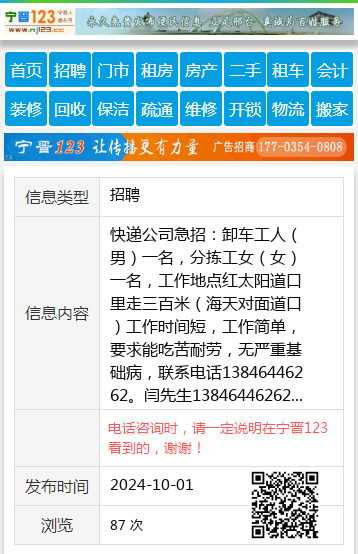快递公司急招:卸车工人(男)一名,分拣工女(女)一名,工作地点红太阳道口里走三百米(海天对面道口)工作时间短,工作简单,要求能吃苦耐劳,无严重基础病,联系电话13846446262。闫先生13846446262 【电话咨询时,请一定说明在七台河信息网看到的,谢谢!】 |