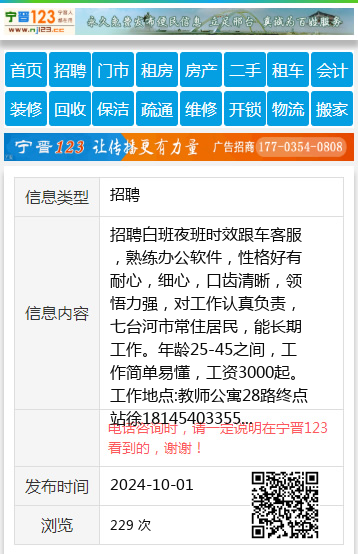 招聘白班夜班时效跟车客服,熟练办公软件,性格好有耐心,细心,口齿清晰,领悟力强,对工作认真负责,七台河市常住居民,能长期工作。年龄25-45之间,工作简单易懂,工资3000起。工作地点:教师公寓28路终点站徐18145403355 【电话咨询时,请一定说明在七台河信息网看到的,谢谢!】 |