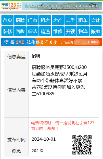 招聘服务员底薪3500加200满勤加酒水提成早9晚9每月有两个带薪休息活好不累一共7张桌期待你的加入庚先生6100989 【电话咨询时,请一定说明在七台河信息网看到的,谢谢!】 |