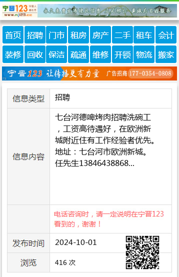 七台河德啤烤肉招聘洗碗工,工资高待遇好,在欧洲新城附近住有工作经验者优先。地址:七台河市欧洲新城。任先生13846438868 【电话咨询时,请一定说明在七台河信息网看到的,谢谢!】 |