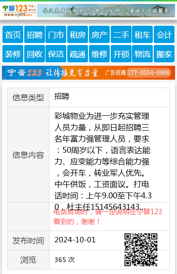 彩城物业为进一步充实管理人员力量,从即日起招聘三名年富力强管理人员,要求:50周岁以下,语言表达能力、应变能力等综合能力强,会开车,转业军人优先。中午供饭,工资面议。打电话时间:上午9.00至下午4.30,杜主任15145643143 【电话咨询时,请一定说明在七台河信息网看到的,谢谢!】 |