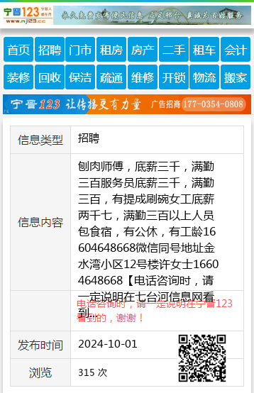 刨肉师傅,底薪三千,满勤三百服务员底薪三千,满勤三百,有提成刷碗女工底薪两千七,满勤三百以上人员包食宿,有公休,有工龄16604648668微信同号地址金水湾小区12号楼许女士16604648668 【电话咨询时,请一定说明在七台河信息网看到的,谢谢!】 |