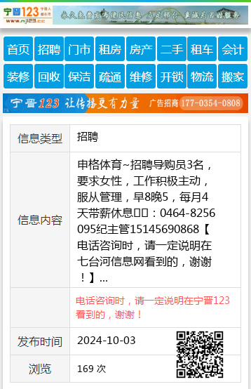 申格体育~招聘导购员3名,要求女性,工作积极主动,服从管理,早8晚5,每月4天带薪休息☎️:0464-8256095纪主管15145690868 【电话咨询时,请一定说明在七台河信息网看到的,谢谢!】 |