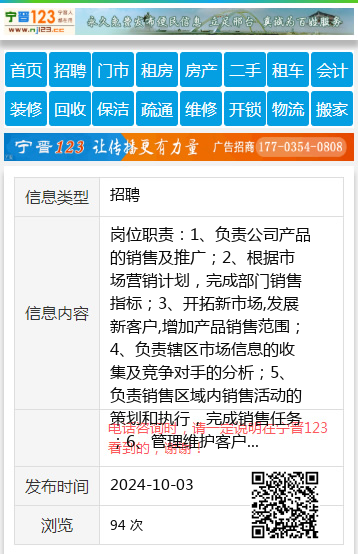 岗位职责:1、负责公司产品的销售及推广;2、根据市场营销计划,完成部门销售指标;3、开拓新市场,发展新客户,增加产品销售范围;4、负责辖区市场信息的收集及竞争对手的分析;5、负责销售区域内销售活动的策划和执行,完成销售任务;6、管理维护客户关系以及客户间的长期战略合作计划。任职资格:1、市场营销等相关专业;2、1-2年以上销售行业工作经验,业绩突出者优先;3、反应敏捷、表达能力强,具有较强的沟通能力及交际技巧,具有亲和力;4、具备一定的市场分析及判断能力,良好的客户服务意识;5、有责任心,能承受较大的工作压力;6、有团队协作精神,善于挑战。工作时间:早7:30晚6曹经理15804640833 【电话咨询时,请一定说明在七台河信息网看到的,谢谢!】 |
