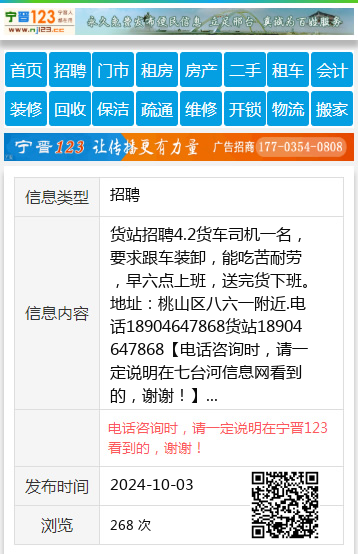 货站招聘4.2货车司机一名,要求跟车装卸,能吃苦耐劳,早六点上班,送完货下班。地址:桃山区八六一附近.电话18904647868货站18904647868 【电话咨询时,请一定说明在七台河信息网看到的,谢谢!】 |