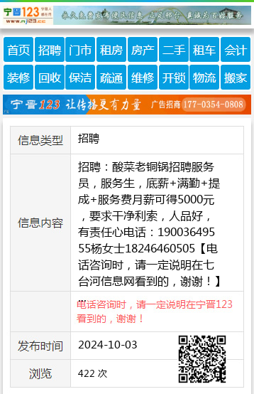 招聘:酸菜老铜锅招聘服务员,服务生,底薪+满勤+提成+服务费月薪可得5000元,要求干净利索,人品好,有责任心电话:19003649555杨女士18246460505 【电话咨询时,请一定说明在七台河信息网看到的,谢谢!】 |