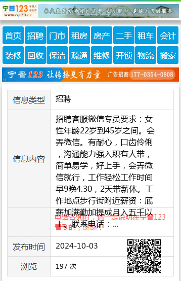 招聘客服微信专员要求:女性年龄22岁到45岁之间。会弄微信。有耐心,口齿伶俐,沟通能力强入职有人带,简单易学,好上手,会弄微信就行,工作轻松工作时间早9晚4.30,2天带薪休。工作地点步行街附近薪资:底薪加满勤加提成月入五千以上。联系电话:18646400872女士18646400872 【电话咨询时,请一定说明在七台河信息网看到的,谢谢!】 |