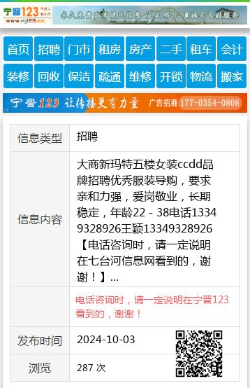 大商新玛特五楼女装ccdd品牌招聘优秀服装导购,要求亲和力强,爱岗敬业,长期稳定,年龄22-38电话13349328926王颖13349328926 【电话咨询时,请一定说明在七台河信息网看到的,谢谢!】 |