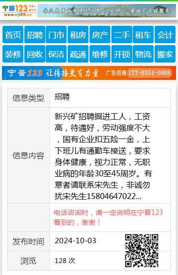 新兴矿招聘掘进工人,工资高,待遇好,劳动强度不大,国有企业扣五险一金,上下班儿有通勤车接送,要求身体健康,视力正常,无职业病的年龄30至45周岁。有意者请联系宋先生,非诚勿扰宋先生15804647022 【电话咨询时,请一定说明在七台河信息网看到的,谢谢!】 |