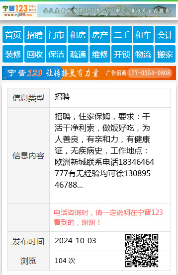 招聘,住家保姆,要求:干活干净利索,做饭好吃,为人善良,有亲和力,有健康证,无疾病史,工作地点:欧洲新城联系电话18346464777有无经验均可徐13089546788 【电话咨询时,请一定说明在七台河信息网看到的,谢谢!】 |
