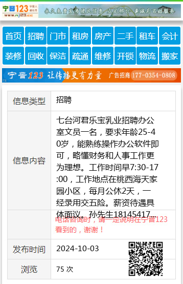 七台河君乐宝乳业招聘办公室文员一名,要求年龄25-40岁,能熟练操作办公软件即可,略懂财务和人事工作更为理想。工作时间早7:30-17:00,工作地点在桃西海天家园小区,每月公休2天,一经录用交五险。薪资待遇具体面议。孙先生18145417749 【电话咨询时,请一定说明在七台河信息网看到的,谢谢!】 |