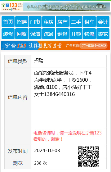 面馆招晚班服务员,下午4点半到9点半,工资1600,满勤加100,店小活好干王女士13846440316