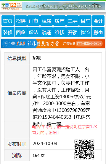 因工作需要现招聘工人一名,年龄不限,男女不限,小学文化即可,负责打包工作,没有大件,工作轻松,月薪=保底工资1300+绩效1元/件=2000-3000左右,有意者速度来电13009798709芝麻粒15946440353 【电话咨询时,请一定说明在七台河信息网看到的,谢谢!】 |