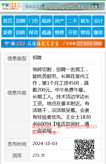 地砖切割,招聘一名男工,能吃苦耐劳。长期在室内工作,第1个月工资4500,满勤200元。中午免费午餐。长期工人。技术活边学边长工资。地点在景丰附近。有活就干,没活就呆着。会者有经验者优先。王女士18304660094 【电话咨询时,请一定说明在七台河信息网看到的,谢谢!】 |