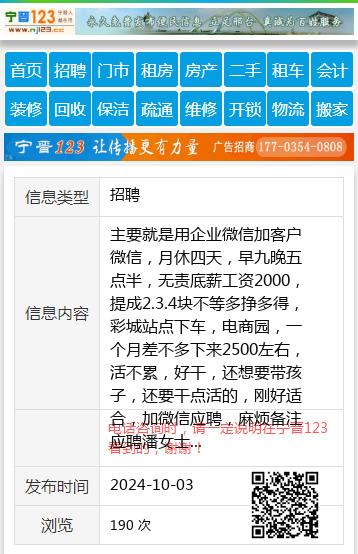 主要就是用企业微信加客户微信,月休四天,早九晚五点半,无责底薪工资2000,提成2.3.4块不等多挣多得,彩城站点下车,电商园,一个月差不多下来2500左右,活不累,好干,还想要带孩子,还要干点活的,刚好适合,加微信应聘,麻烦备注应聘潘女士18724640218 【电话咨询时,请一定说明在七台河信息网看到的,谢谢!】 |