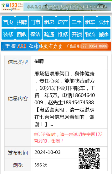 鹿场招喂鹿俩口,身体健康,责任心强,能够吃苦耐劳,60岁以下会开四轮车,工资一年5万。电话18604640009,赵先生18945474588 【电话咨询时,请一定说明在七台河信息网看到的,谢谢!】 |