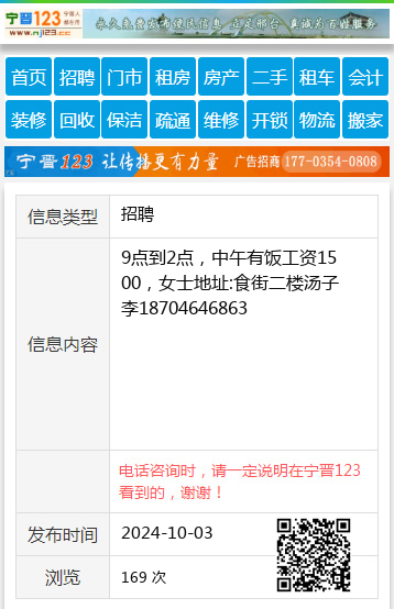 9点到2点,中午有饭工资1500,女士地址:食街二楼汤子李18704646863