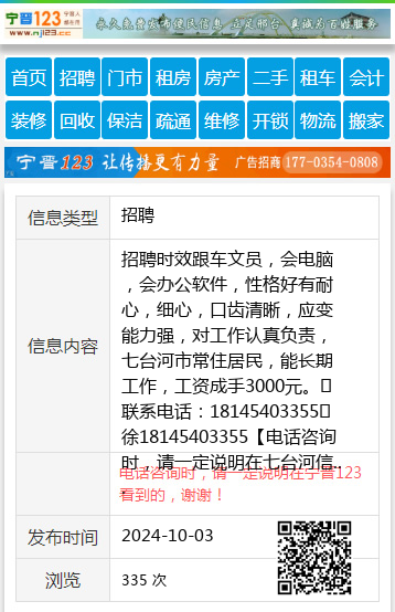 招聘时效跟车文员,会电脑,会办公软件,性格好有耐心,细心,口齿清晰,应变能力强,对工作认真负责,七台河市常住居民,能长期工作,工资成手3000元。联系电话:18145403355徐18145403355 【电话咨询时,请一定说明在七台河信息网看到的,谢谢!】 |