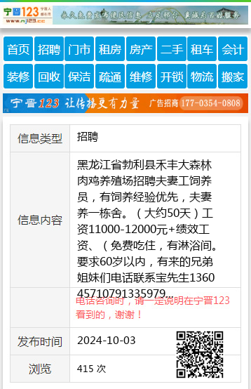 黑龙江省勃利县禾丰大森林肉鸡养殖场招聘夫妻工饲养员,有饲养经验优先,夫妻养一栋舍。(大约50天)工资11000-12000元+绩效工资、(免费吃住,有淋浴间。要求60岁以内,有来的兄弟姐妹们电话联系宝先生1360457107913359799565宝先生13359799565 【电话咨询时,请一定说明在七台河信息网看到的,谢谢!】 |