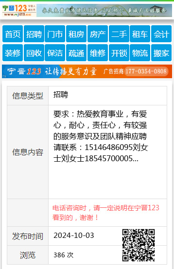 要求:热爱教育事业,有爱心,耐心,责任心,有较强的服务意识及团队精神应聘请联系:15146486095刘女士刘女士18545700005 【电话咨询时,请一定说明在七台河信息网看到的,谢谢!】 |