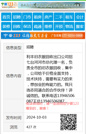利丰旧衣服回收出口公司招七台河河市总代理一名,负责全市的旧衣服回收,集中,公司给于价格全面支持,技术扶持,需要有实力的来,想创业的有能力的。我只选志同道合的合作伙伴!讲诚信的。联系电话13946506087王总13946506087 【电话咨询时,请一定说明在七台河信息网看到的,谢谢!】 |