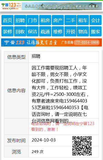 因工作需要现招聘工人,年龄不限,男女不限,小学文化即可,负责打包工作,没有大件,工作轻松,绩效工资2元/件=2500-3000左右,有意者速度来电15946440353芝麻粒15946440353 【电话咨询时,请一定说明在七台河信息网看到的,谢谢!】 |