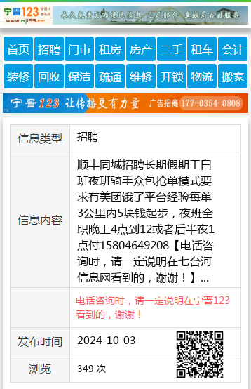 顺丰同城招聘长期假期工白班夜班骑手众包抢单模式要求有美团饿了平台经验每单3公里内5块钱起步,夜班全职晚上4点到12或者后半夜1点付15804649208 【电话咨询时,请一定说明在七台河信息网看到的,谢谢!】 |