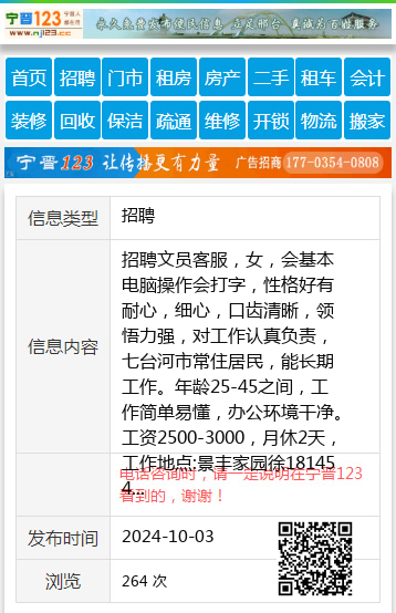 招聘文员客服,女,会基本电脑操作会打字,性格好有耐心,细心,口齿清晰,领悟力强,对工作认真负责,七台河市常住居民,能长期工作。年龄25-45之间,工作简单易懂,办公环境干净。工资2500-3000,月休2天,工作地点:景丰家园徐18145403355 【电话咨询时,请一定说明在七台河信息网看到的,谢谢!】 |