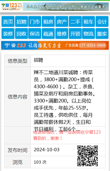 辣不二地道川菜诚聘:传菜员,3800+满勤200+提成(4300-4600)。杂工,杀鱼、摘菜及前厅和厨房后勤事务。3300+满勤200。以上岗位成手优先,年龄25-55岁。员工待遇,供吃供住,每月满勤带薪休假2天,生日和节日福利,工龄6个月涨50元,季度和年度经营业绩奖金。联系人:祝先生联系电话:19845570003、15846195888工作地址:七台河市桃山区文华路92号祝先。19845570003 【电话咨询时,请一定说明在七台河信息网看到的,谢谢!】 |
