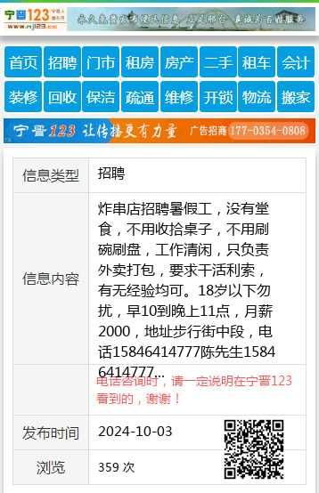 炸串店招聘暑假工,没有堂食,不用收拾桌子,不用刷碗刷盘,工作清闲,只负责外卖打包,要求干活利索,有无经验均可。18岁以下勿扰,早10到晚上11点,月薪2000,地址步行街中段,电话15846414777陈先生15846414777 【电话咨询时,请一定说明在七台河信息网看到的,谢谢!】 |