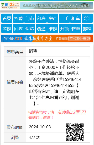 外貌干净整洁,性格温柔耐心,工资2000+工作轻松不累,环境舒适简单。联系人:余经理联系电话15946414655余经理15946414655 【电话咨询时,请一定说明在七台河信息网看到的,谢谢!】 |