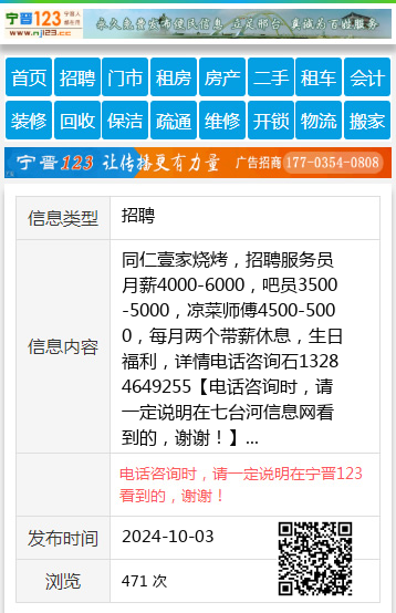 同仁壹家烧烤,招聘服务员月薪4000-6000,吧员3500-5000,凉菜师傅4500-5000,每月两个带薪休息,生日福利,详情电话咨询石13284649255 【电话咨询时,请一定说明在七台河信息网看到的,谢谢!】 |