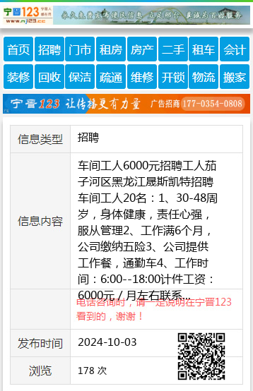 车间工人6000元招聘工人茄子河区黑龙江晟斯凯特招聘车间工人20名:1、30-48周岁,身体健康,责任心强,服从管理2、工作满6个月,公司缴纳五险3、公司提供工作餐,通勤车4、工作时间:6:00--18:00计件工资:6000元/月左右联系电话:13846479963公司地址:七台河市茄子河区姜女士13946526030 【电话咨询时,请一定说明在七台河信息网看到的,谢谢!】 |