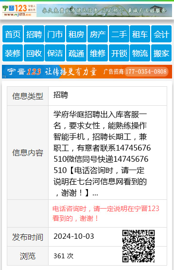 学府华庭招聘出入库客服一名,要求女性,能熟练操作智能手机,招聘长期工,兼职工,有意者联系14745676510微信同号快递14745676510 【电话咨询时,请一定说明在七台河信息网看到的,谢谢!】 |