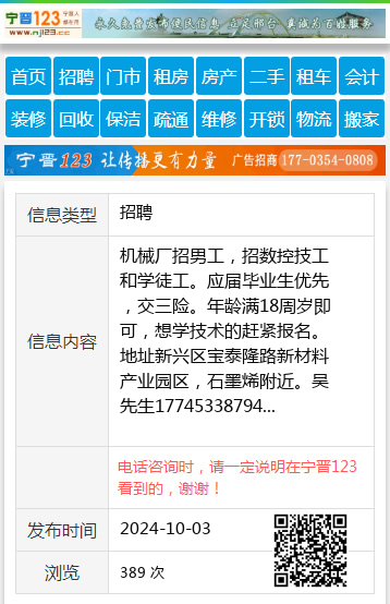 机械厂招男工,招数控技工和学徒工。应届毕业生优先,交三险。年龄满18周岁即可,想学技术的赶紧报名。地址新兴区宝泰隆路新材料产业园区,石墨烯附近。吴先生17745338794 【电话咨询时,请一定说明在七台河信息网看到的,谢谢!】 |